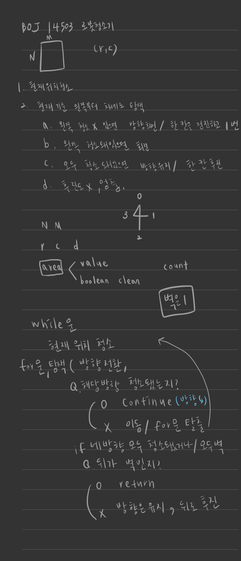 - '네 방향 모두 청소가 이미 되어있거나 벽인 경우에는, 바라보는 방향을 유지한 채로 한 칸 후진을 하고 2번으로 돌아간다' 라는 설명을 보고 후진을 2칸 한다고 마음대로 읽어버렸다 .. 왜 그랬는지는 정말 모르겠지만 .. 문제를 꼼꼼히 읽자 제발