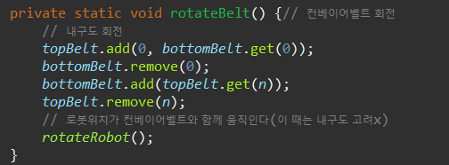 내구도의 값을 가지고 있는 컨베이어벨트가 회전한 뒤에는 rotateRobot() 메소드에서 컨베이어벨트가 로봇을 가지고 있는지에 대한 정보를 업데이트 해주어야 한다. (한 칸 씩 회전 방향으로 민다)