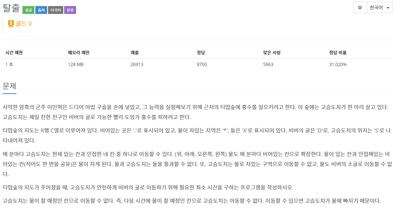 [BOJ/Java] 3055 : 탈출 본문