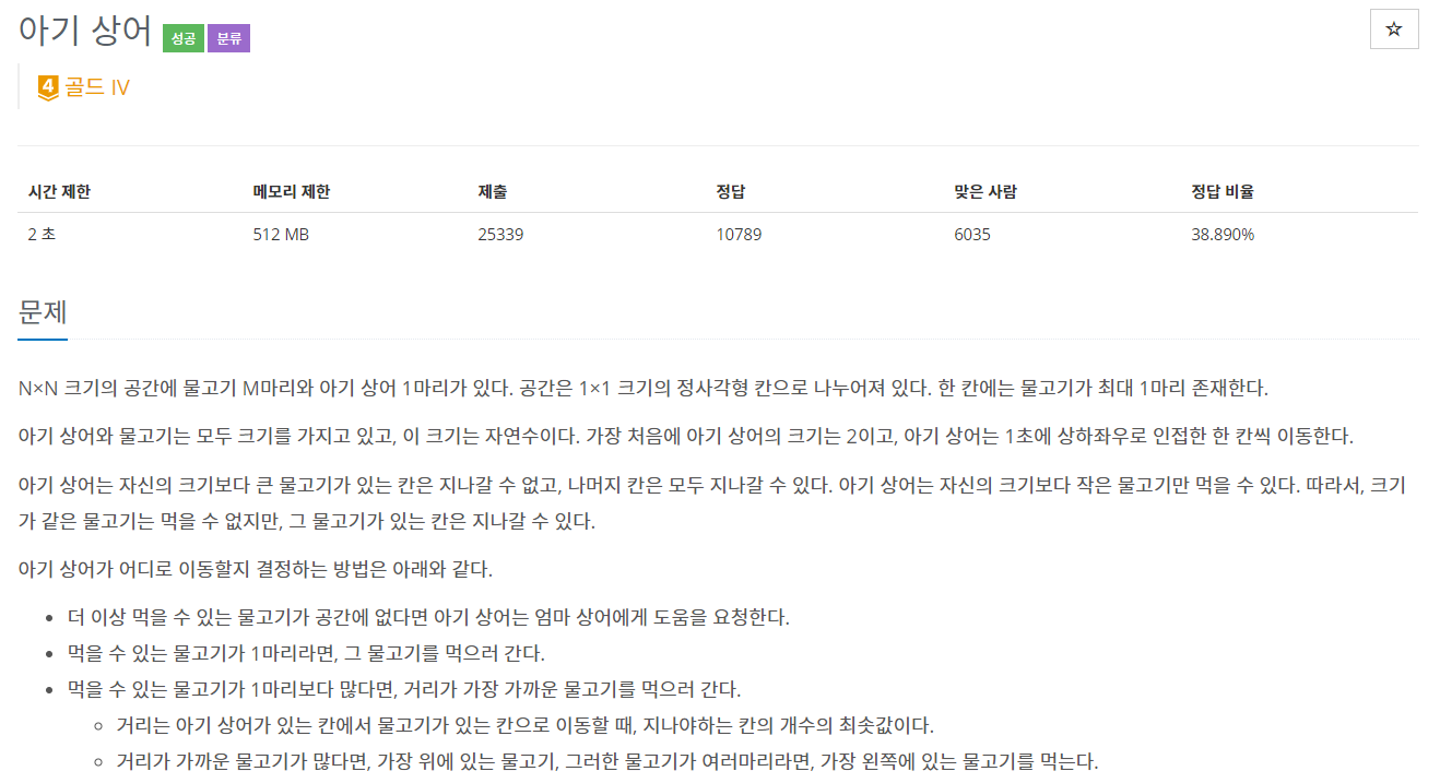 N×N 크기의 공간에 물고기 M마리와 아기 상어 1마리가 있다. 공간은 1×1 크기의 정사각형 칸으로 나누어져 있다. 한 칸에는 물고기가 최대 1마리 존재한다. 아기 상어와 물고기는 모두 크기를 가