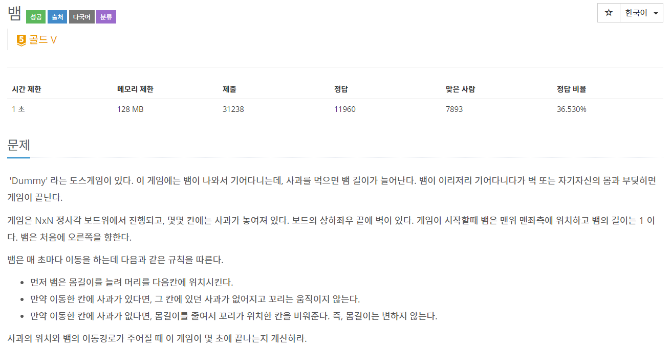 뱀이 사과를 먹으면 길이가 늘어나고, 주어진 시간과 방향대로 방향을 전환해야 하는 문제 / 종료 조건은 뱀이 범위를 벗어날 때와 자기 자신의 몸과 부딪힐 때
