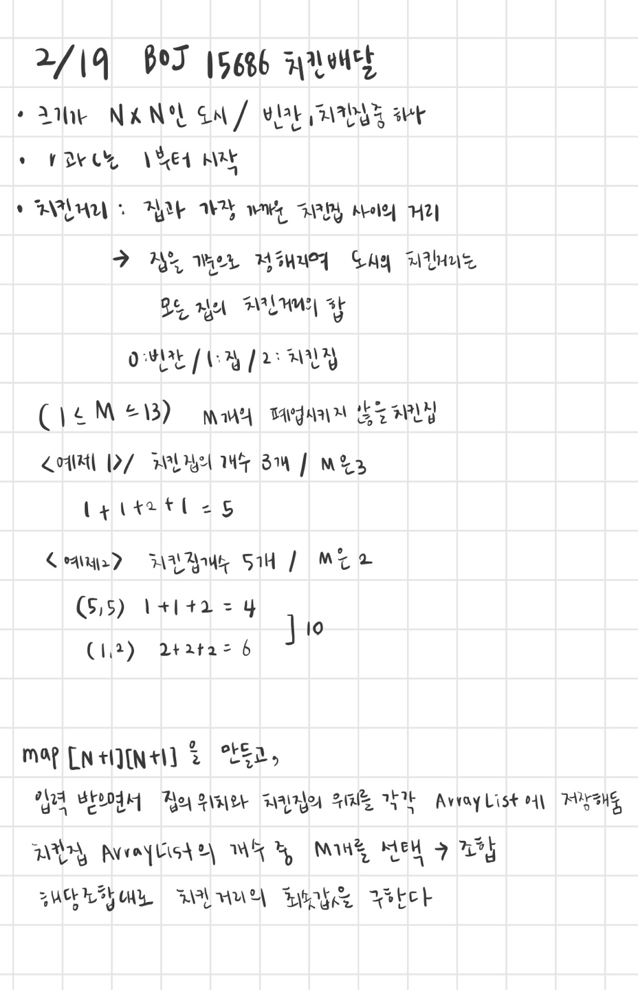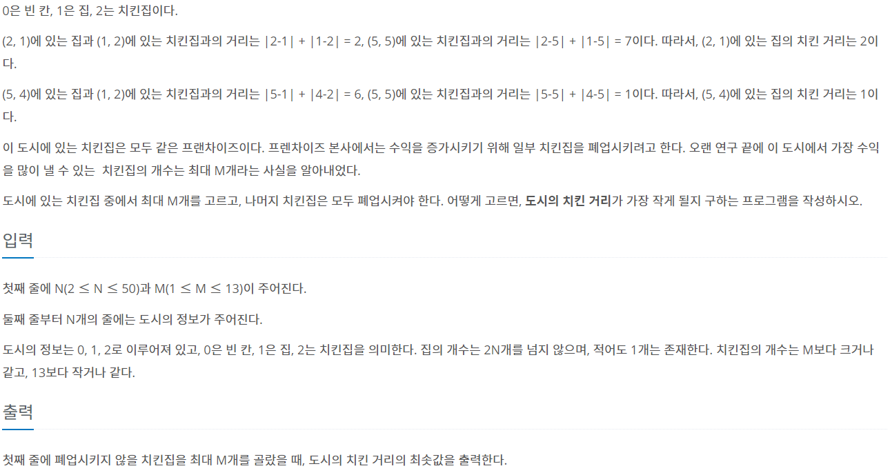 어제 풀었던 최적경로 문제와 비슷해서인지 특별한 문제 없이 풀 수 있었다 / 사실 bfs 써서 가까운 치킨집을 찾으려다가 어차피 폐업시키지 않을 치킨집 최대 개수가 13이라 모두 비교했다