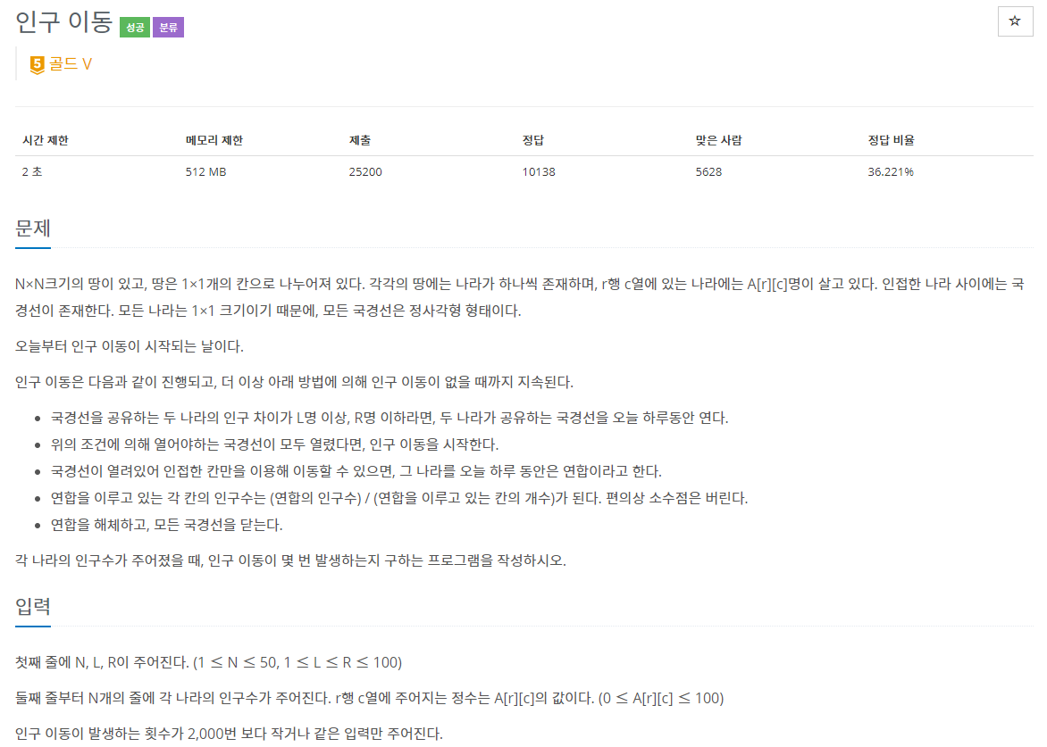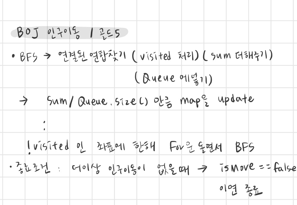 처음에 조금 헤맸지만, 알고보니 쉬운 문제였다. BFS를 사용해 연결된 연합을 찾고 visited 처리해주어서 다시 방문하지 않도록 한다. 연합을 찾을 때마다 해당 맵을 update 해준다!