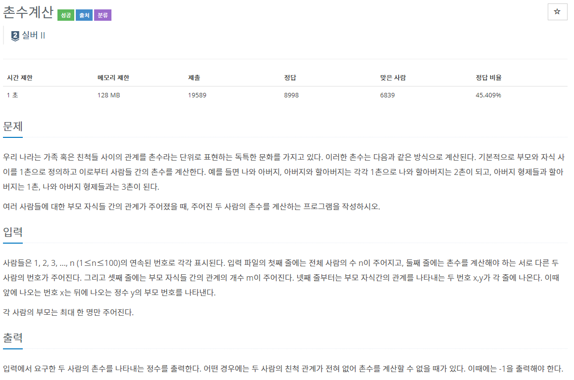 사람들은 1, 2, 3, …, n (1≤n≤100)의 연속된 번호로 각각 표시된다. 입력 파일의 첫째 줄에는 전체 사람의 수 n이 주어지고, 둘째 줄에는 촌수를 계산해야 하는 서로 다른 두 사람의 번호가 주어진